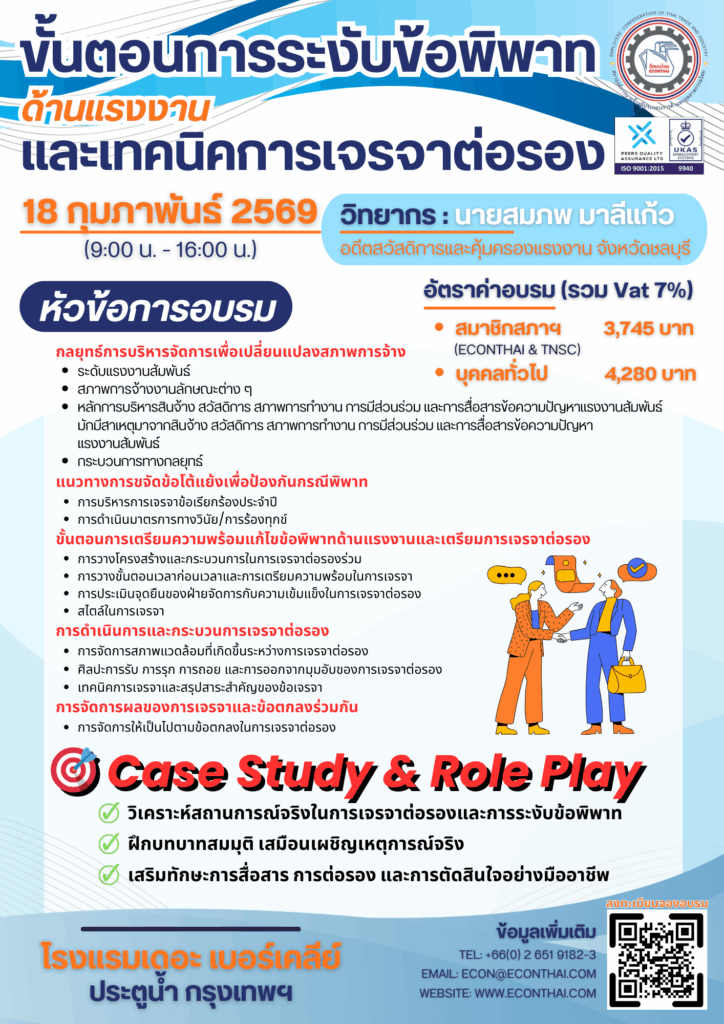📌 หลักสูตร ขั้นตอนการระงับข้อพิพาทด้านแรงงาน และเทคนิคการเจรจาต่อรอง